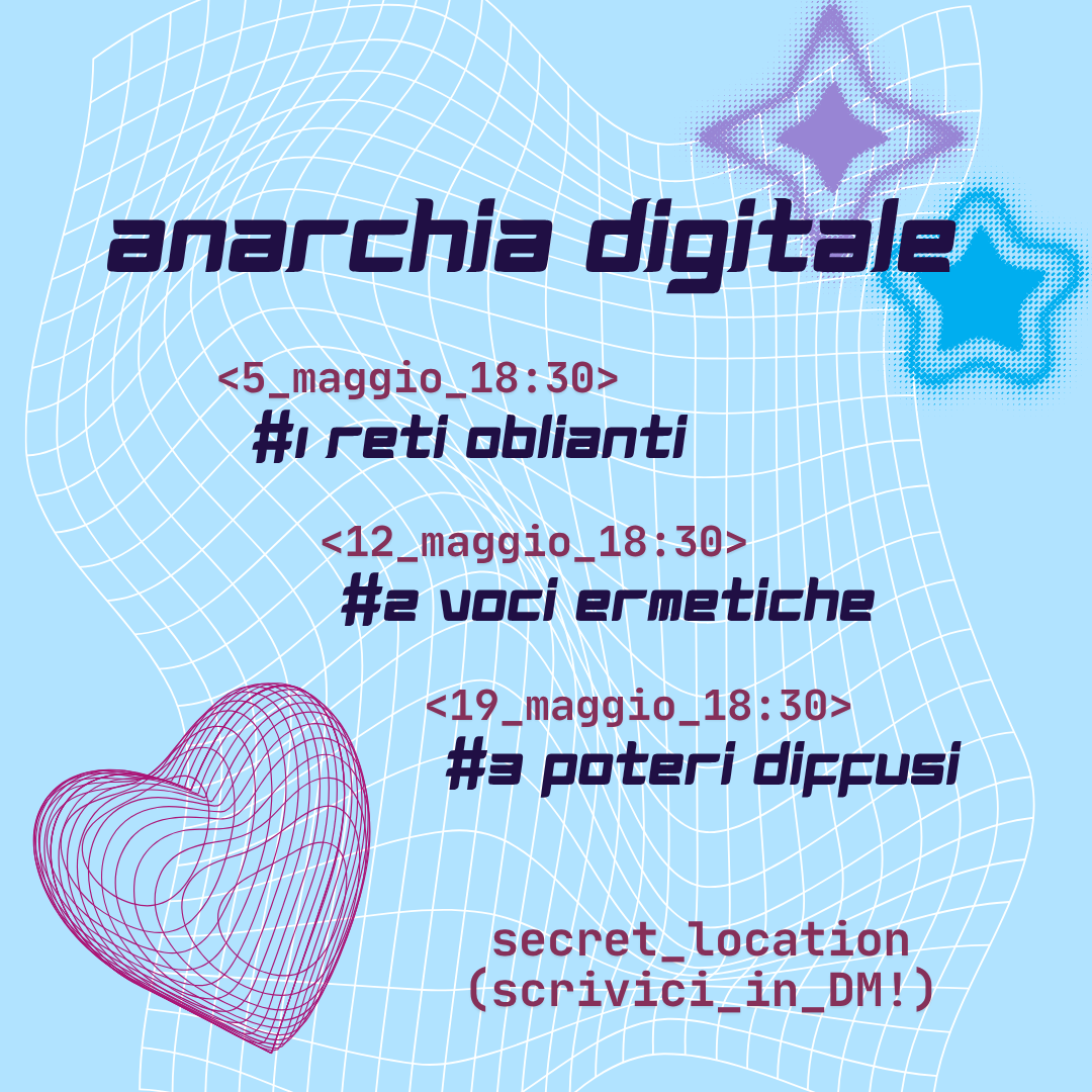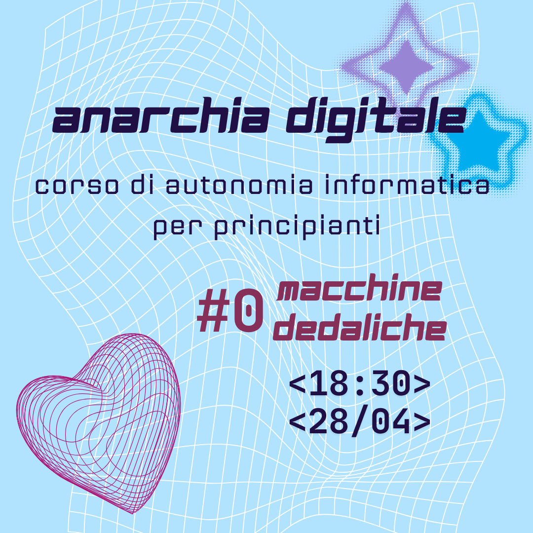 ./ Con l'avanzare inesorabile della digitalizzazione in ogni ambito, essere in grado di difendersi senza isolarsi e` fondamentale. In questo ciclo di corsi da aperitivo cercheremo di imparare come farlo.